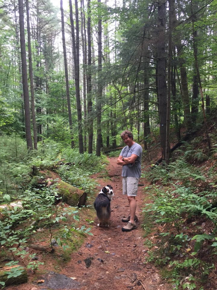 Roscoe hiking the woods near Northwest Bay
